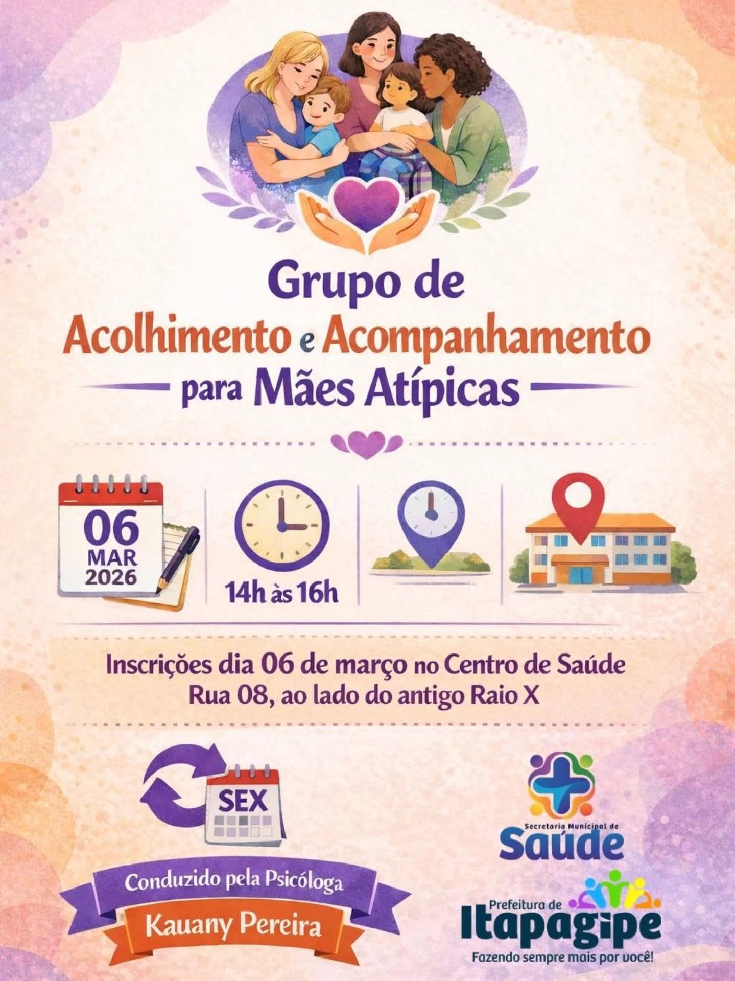 A Secretaria Municipal de Saúde informa o início do Grupo de Acolhimento e Acompanhamento para Mães Atípicas, um espaço de escuta, apoio emocional e troca de experiências.