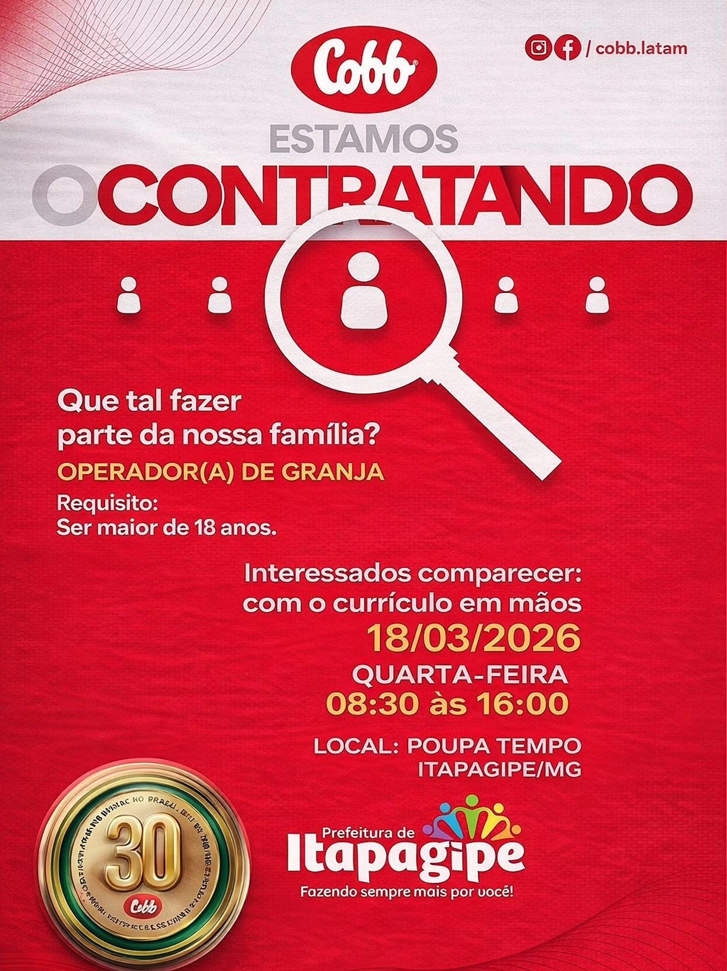 A Prefeitura de Itapagipe, em parceria com a Granja COBB, informa que ainda há vagas de emprego disponíveis e que será realizado, nesta quarta-feira, um mutirão de recrutamento para interessados em ingressar na empresa.