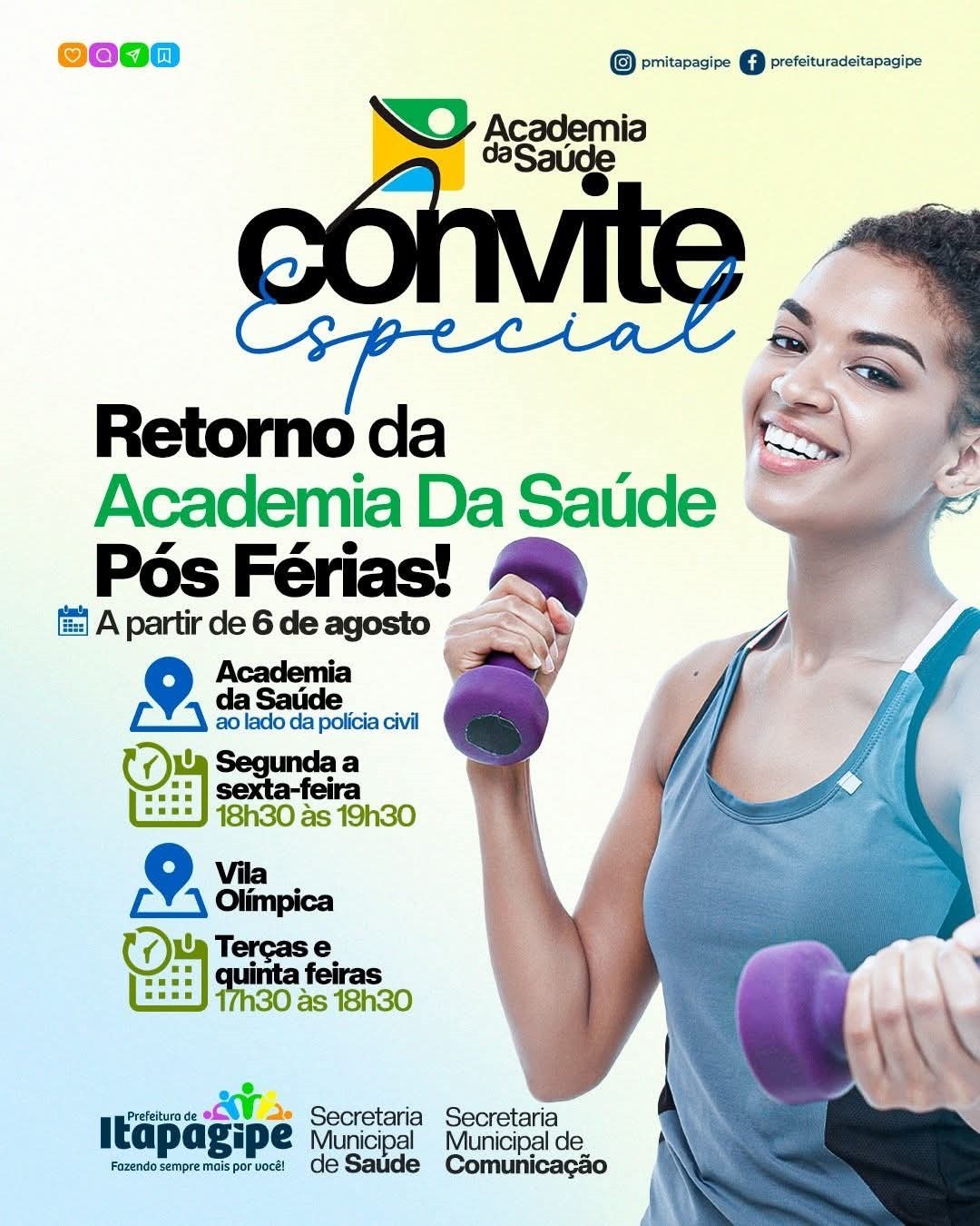 A Prefeitura de Itapagipe e a Secretaria Municipal de Saúde, convida para o retorno das atividades da Academia da Saúde a partir do dia 06 de agosto.
