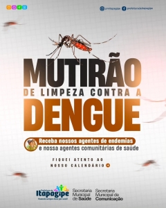 A Prefeitura de Itapagipe, por meio da Secretaria Municipal de Saúde, realizará um mutirão de limpeza contra a dengue