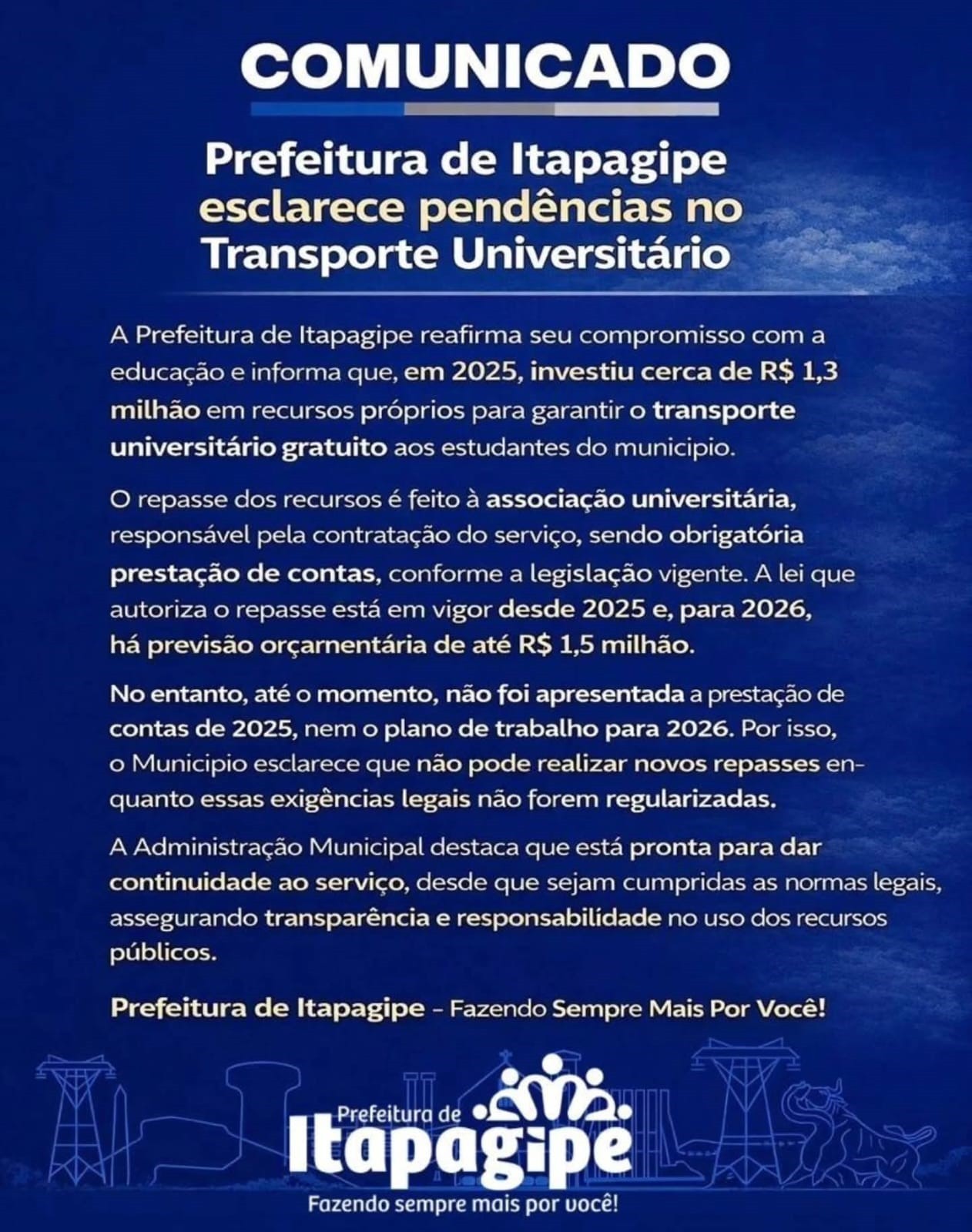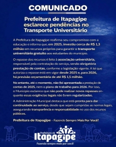 A Prefeitura Municipal de Itapagipe reafirma seu compromisso com a educação e informa que, no ano de 2025, investiu aproximadamente R$ 1.300.000,00 em recursos próprios para garantir o transporte universitário gratuito aos estudantes do município.